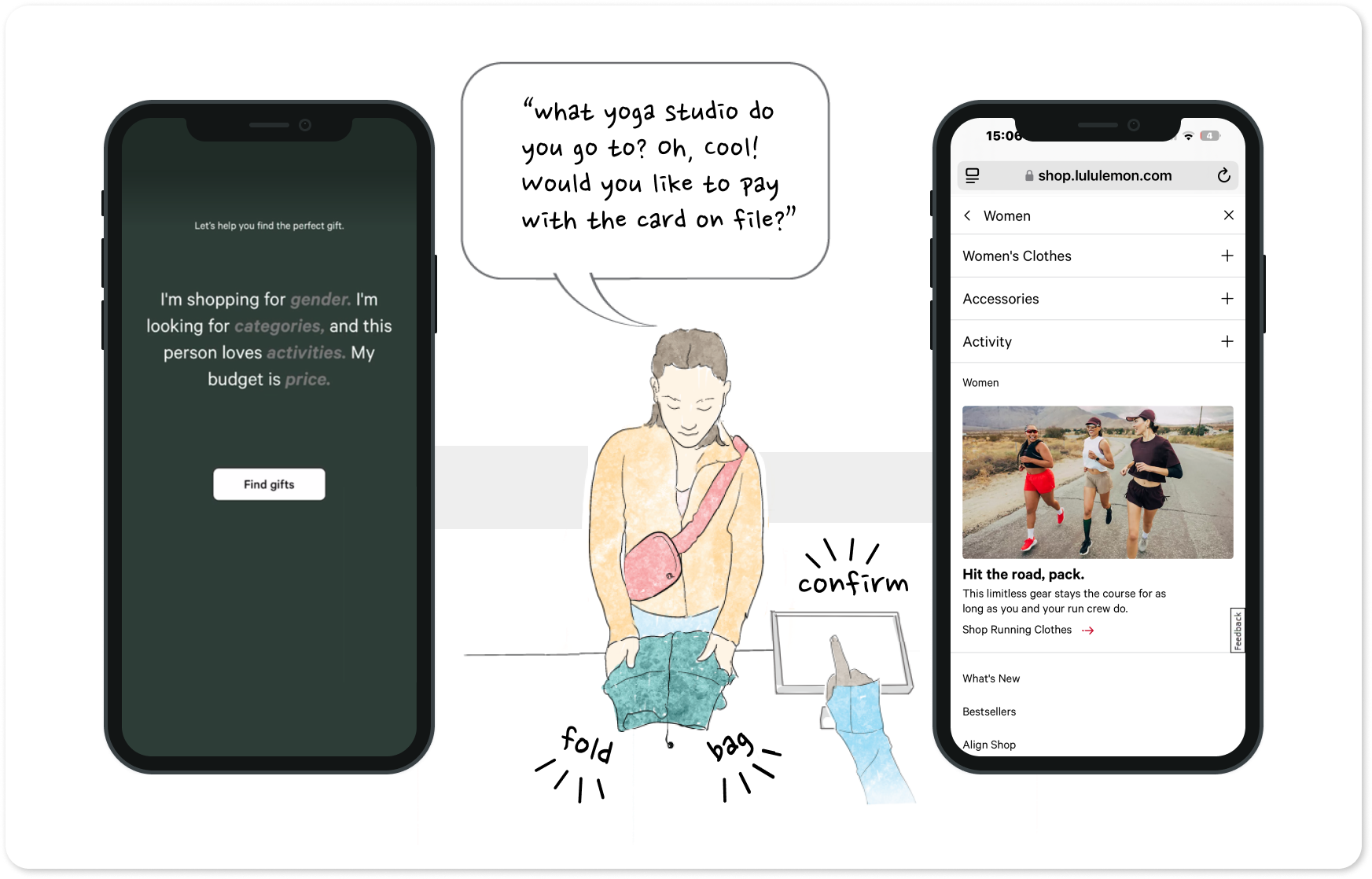 I led a silo-busting research project for lululemon. I conducted original and secondary research, and synthesized our findings into fresh design concepts to inspire the future of omni-channel checkout experiences
